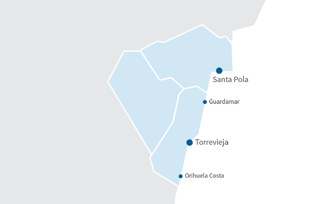 От Дении до Масаррона, проходя по таким известным месторасположениям, как Бенидорм, Альтея, Гуардамар, Сьюдад Кесада, Торревьеха, Ориуэла Коста, Лос Алькасарес или Ла Манга Мар Менор. Будь-то жилье с видом на море, на первой линии поля для гольфа со всеми близко расположенными услугами и т. д., во всех месторасположениях мы предлагаем жилье, способное адаптироваться к нуждам покупателя.